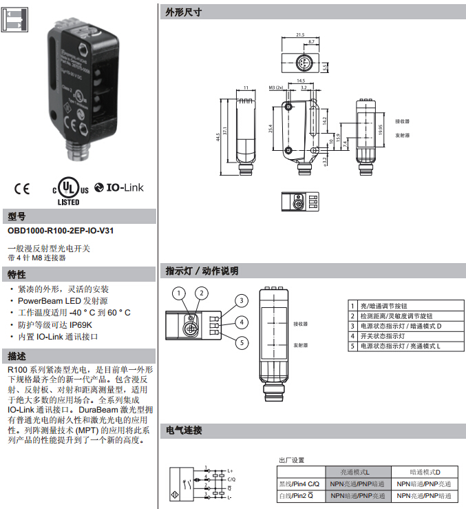 OBD1000-R100-2EP-IO-V31,漫反射型傳感器