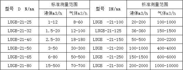 | 型號(hào) D N/mm | 標(biāo)準(zhǔn)測(cè)量范圍 | 型號(hào) DN/mm | 析準(zhǔn)測(cè)量范圍 | ||