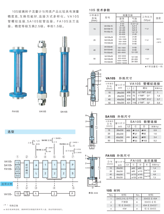 10S玻璃轉(zhuǎn)子流量計(jì)與同類(lèi)產(chǎn)品比較具有測(cè)量精度高,互換性能好,連接方式多樣化,VA10S管螺紋連接,SA10S軟管連接,F(xiàn)A10S法蘭連接,精度等級(jí)互換2.5級(jí),單標(biāo)1.5級(jí)。