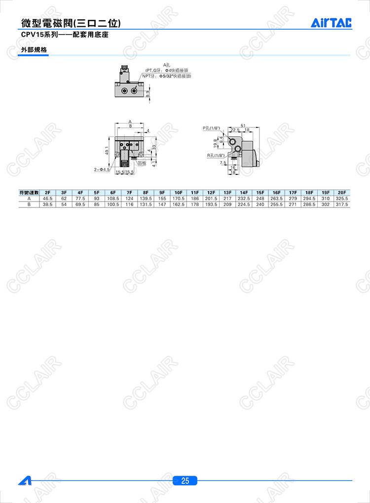 CPV15M2F,CPV15M2FG,CPV15M2FT,CPV15M3F,CPV15M3FG,CPV15M3FT,AIRTAC微型電磁閥底座