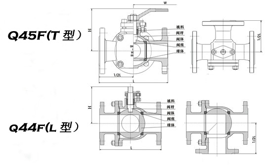Q45F三通四密封球閥可分為L(zhǎng)形和T形,L形(Q44F)三通球閥用于介質(zhì)流向的切換,能使相互垂直的兩個(gè)通道連接;T形(Q45F)三通球閥用于介質(zhì)分流、合流及流向切換。T形三通可以使三個(gè)通道相互連通或使其中的兩個(gè)通道連通。三通球閥一般采用兩閥座結(jié)構(gòu),亦可根據(jù)用戶要求采用四閥座結(jié)構(gòu)。