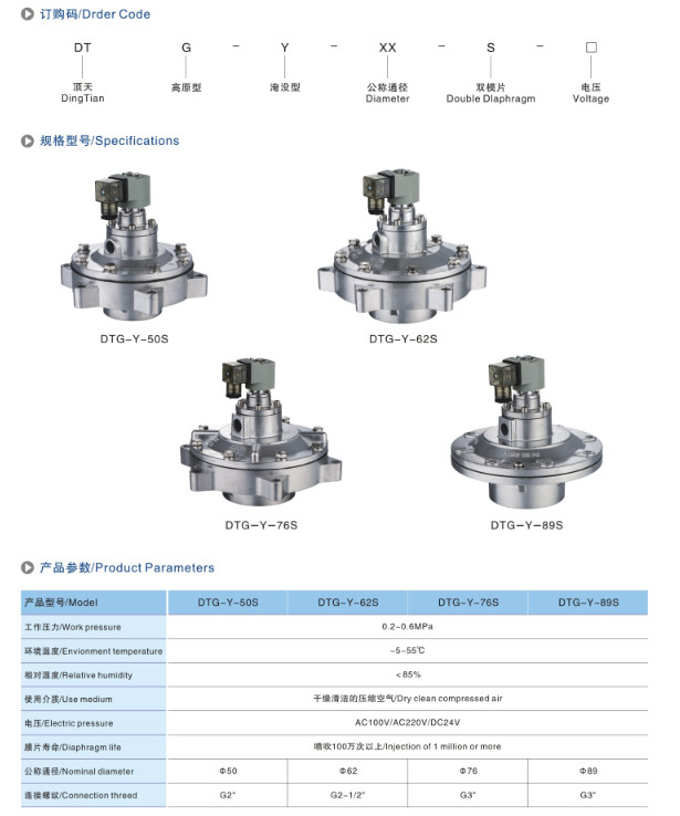 DTG-Y-50S,DTG-Y-62S,DTG-Y-76S,DTG-Y-89S,淹沒式脈沖閥