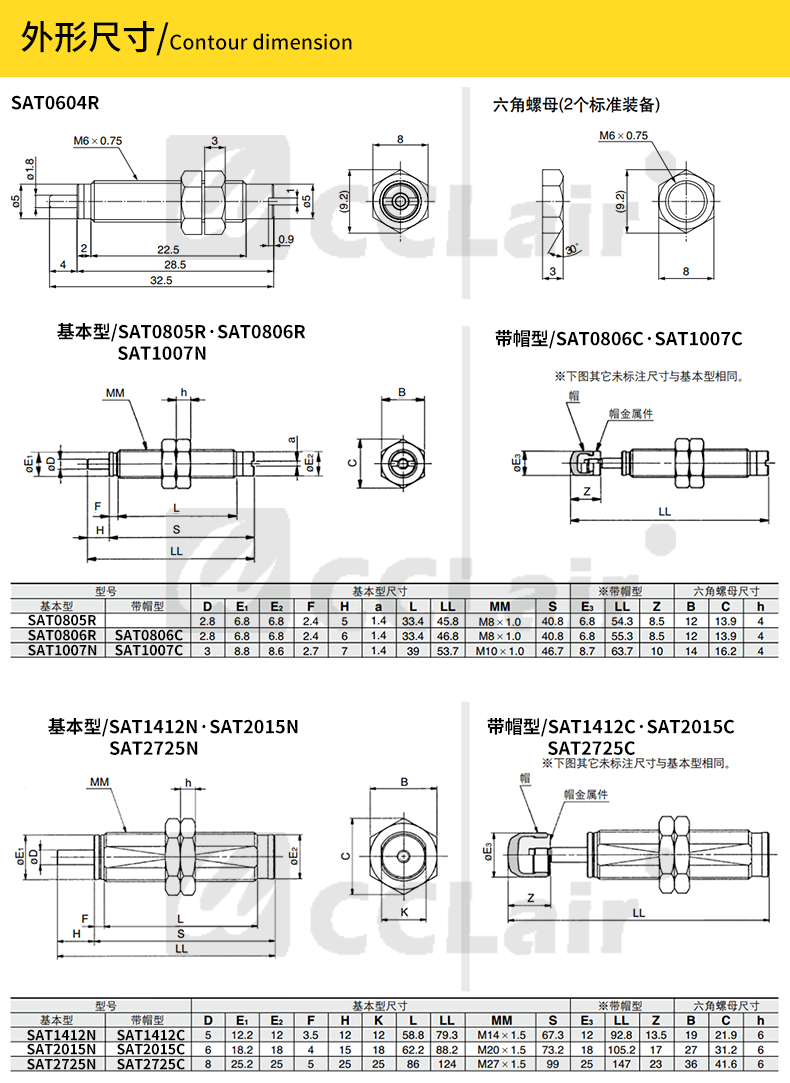 SAT-0604R,SAT-0806R,SAT-0806N,SAT-1007N,SAT-1210N,SAT-1412N,液壓緩沖器,CHELIC氣立可型,SAT不帶緩沖頭 SAT-2015N,SAT-2525N,SAT-2725N,