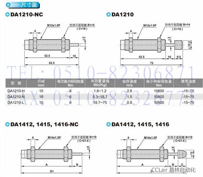 DA0806-H,DA0806-N,DA0806-L,DA1005-H,DA1008,DA2020,DA2030,DA2050,DA1210,DA1412,DA1415,DA1416,油壓緩沖器