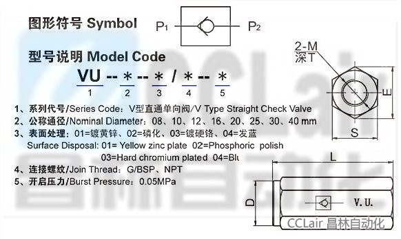 VU-08-G1/4,VU-10-G3/8,VU-12-G1/2,VU-16-G3/4,VU-20-G1,VU-25-G5/4,VU-30-G3/2,VU-40-G2,直通單向閥
