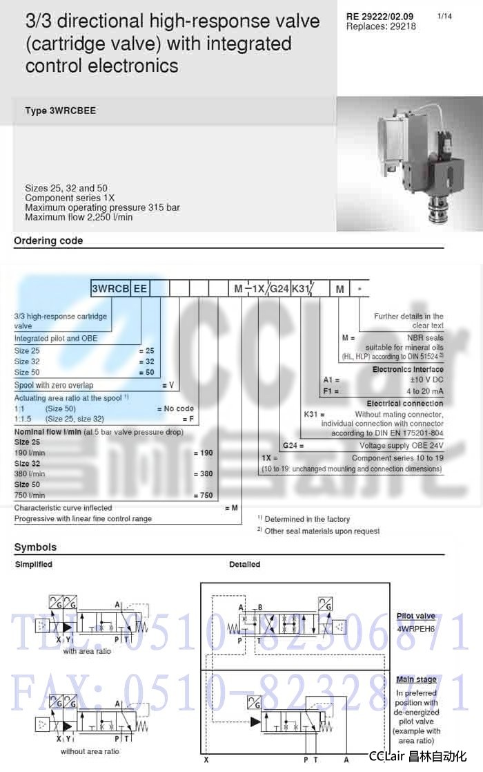 3WRCBEE25VF190M-1X/G24K31/A1M,3WRCBEE25VF190M-1X/G24K31/F1M,先導(dǎo)式方向控制閥,力士樂REXROTH,德國力士樂