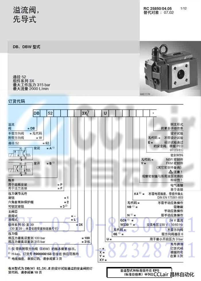DB52P1-3X/100U,DB52P1-3X/100XU,DB52P1-3X/100XYU,先導式溢流閥,力士樂REXROTH,德國力士樂 |