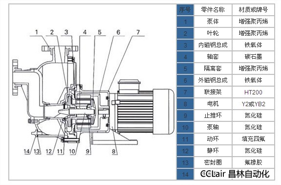 過流部件材質(zhì):PP(增強聚丙烯)、PVF2(聚偏二氟乙烯)