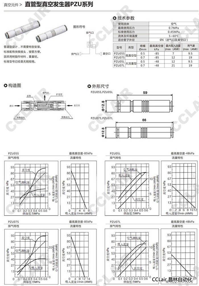 PZU05S,PZU07S,PZU05L,PZU07L,直管型真空發(fā)生器