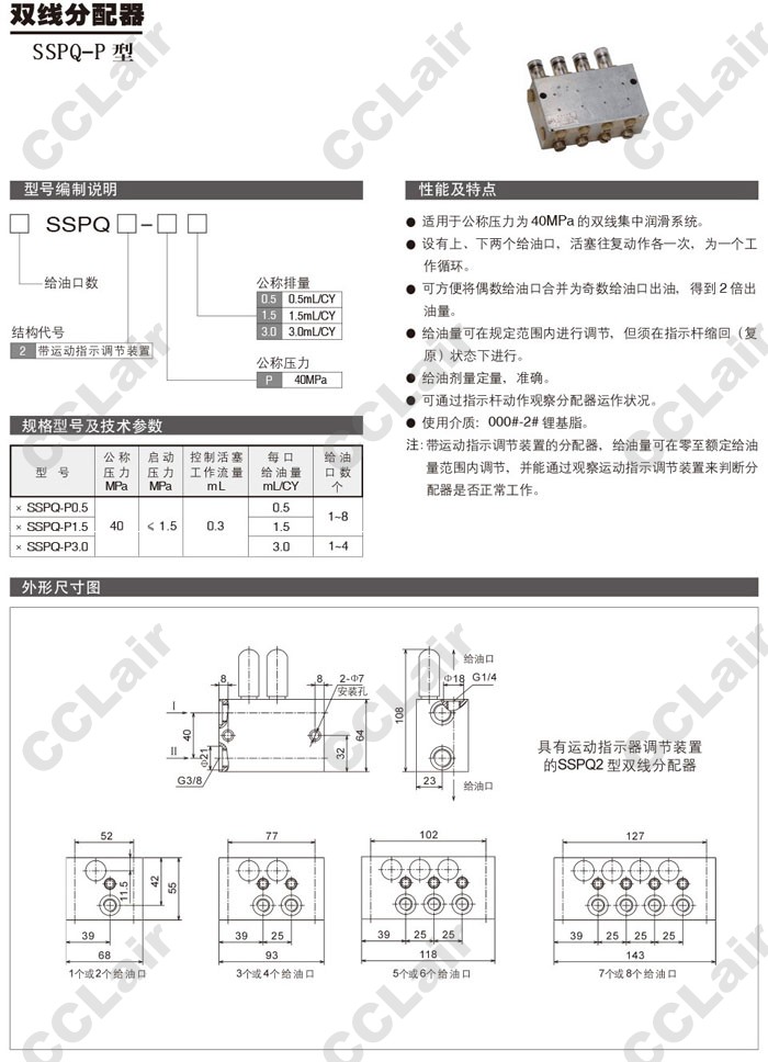 型號: 1SSPQ,2SSPQ,3SSPQ,4SSPQ,5SSPQ,6SSPQ,7SSPQ,8SSPQ,3SSPQ-P1.5,1SSPQ-P0.5,4SSPQ-P3.0,雙線分配器