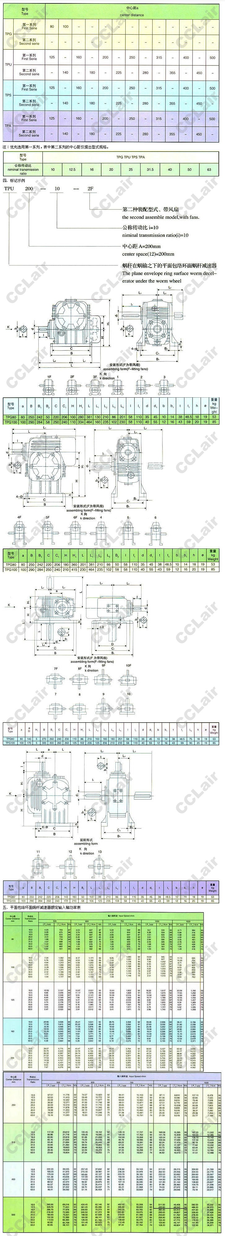 該減速器系列有四種型式:TPG、TPU、TPA、TPS.其中:TP-平面包絡(luò)環(huán)面蝸桿組合為