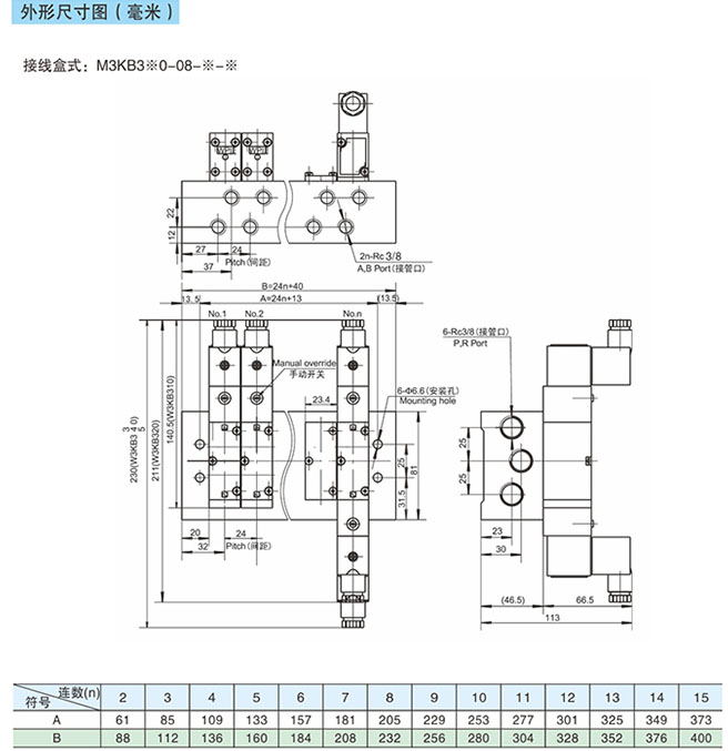 M3KB310-10,M3KB320-10,M3KB330-10,M3KB340-10,M3KB350-10,M3KB380-10,M3KB310-10-B,先導式5通匯流板型電磁閥 |