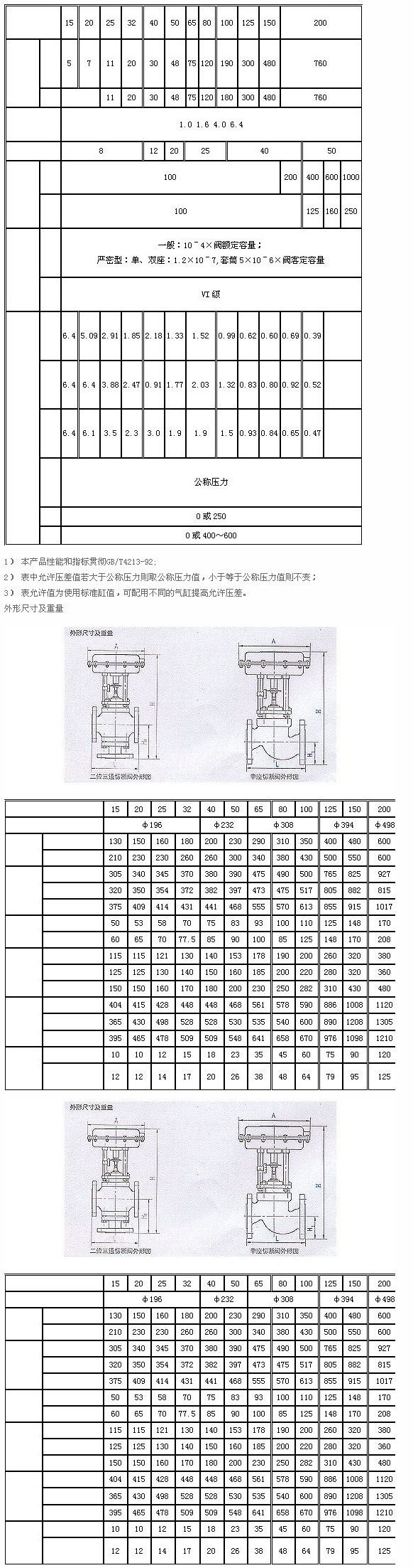 本系列產(chǎn)品有薄膜式、活塞式兩種。閥體結(jié)構(gòu)有單座、套筒、雙座(二位三通)三種,密封形式有填料密封和波紋管密封兩種,產(chǎn)品公稱壓力等級(jí)有PN10、16、40、46四種,公稱口徑范圍DN20~200mm。適用流體溫度由-60~450℃。泄漏量等級(jí)為IV級(jí)或VI級(jí)。流量特性為快開(kāi)。