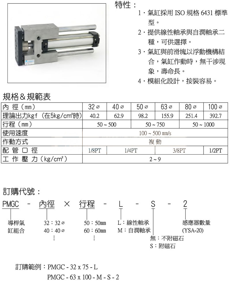 PMGC-32,PMGC-40,PMGC-50,PMGC-63,PMGC-80,PMGC-100,panix導桿氣缸組合