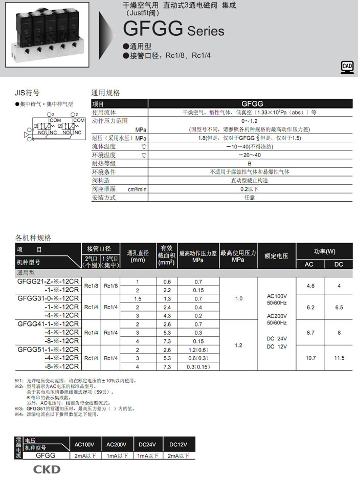 GFGG21-Z-2-12CR,GFGG31-0-2-12CR,GFGG41-1-2-12CR,GFGG51-1-2-12CR,CKD直動式3通電磁閥