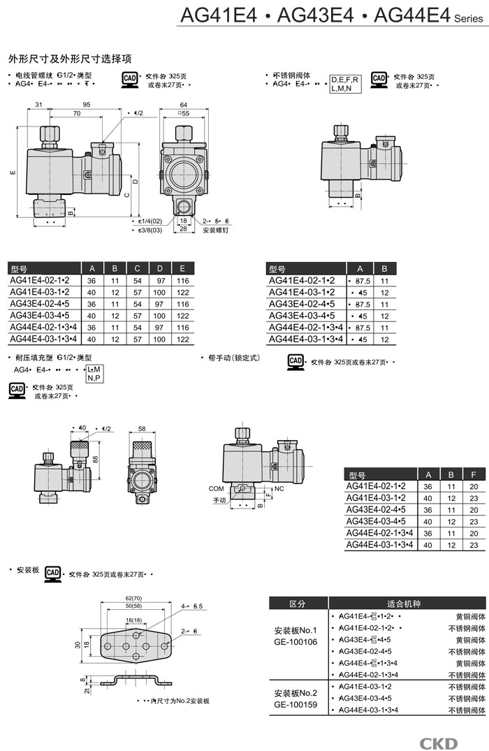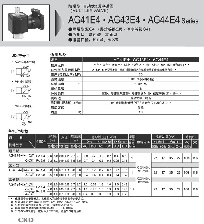 AG41E4-02-1,AG41E4-03-1,AG43E4-02-4,AG43E4-03-4,AG44E4-02-1,AG44E4-03-1,CKD直動(dòng)式3通電磁閥