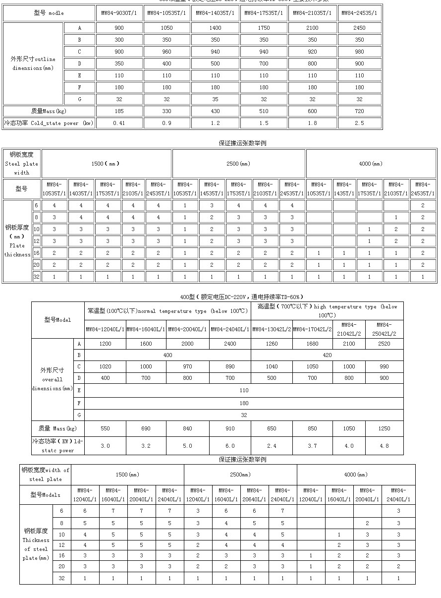 本系列產(chǎn)品是專為吊運(yùn)中厚鋼板而設(shè)計(jì)的。吊運(yùn)作業(yè)安全準(zhǔn)確迅速??紤]到長(zhǎng)鋼板吊運(yùn)可能出現(xiàn)彎曲變形而影響安全搬運(yùn),所以在吊運(yùn)長(zhǎng)尺寸鋼板時(shí),請(qǐng)使用多臺(tái)電磁鐵聯(lián)用。對(duì)于中厚板(6mm-32mm)電磁鐵的間距多取3-4米,兩端外伸部分的長(zhǎng)度可取間距的二分之一。根據(jù)吊運(yùn)張數(shù)的不同,又分為350型和400型兩類。350型適合于中厚板長(zhǎng)、造船廠、機(jī)械制造廠,采用調(diào)磁控制方式,能起吊一張或一定張數(shù)鋼板。400型適用于一次搬運(yùn)盡量多的張數(shù),可根據(jù)用戶要求另行設(shè)計(jì)制造吊運(yùn)700℃一下鋼板用高溫型產(chǎn)品。