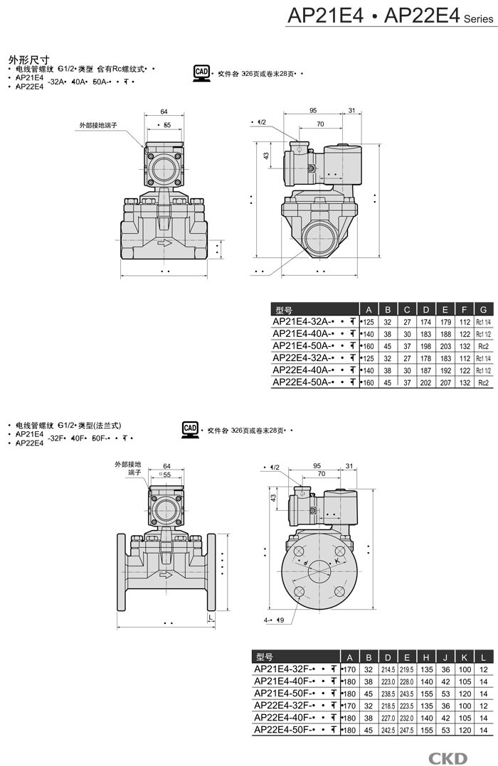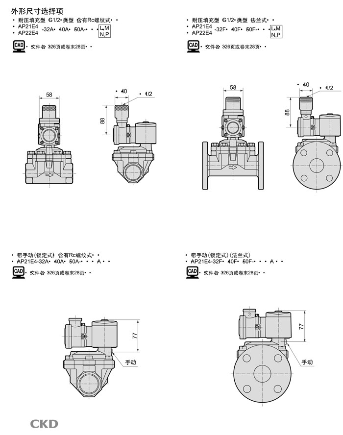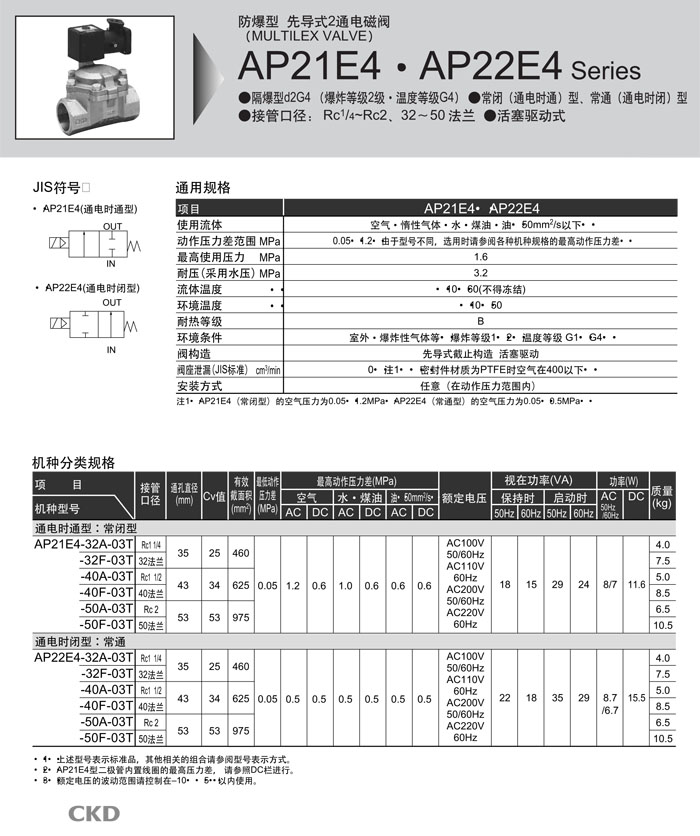 AP21E4-32,AP21E4-40,AP21E4-50,AP22E4-32,AP22E4-40,AP22E4-50,CKD先導式2通電磁閥