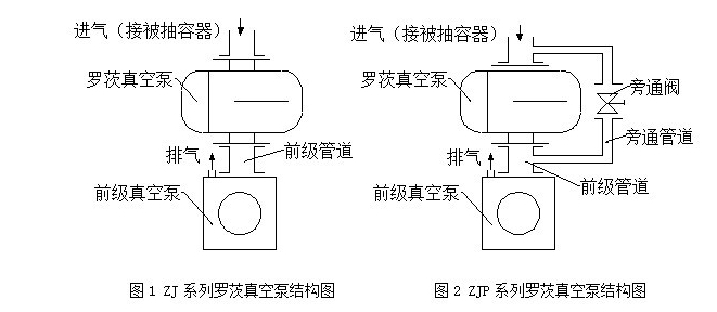 二、ZJ系列羅茨真空泵在較低入口壓力時具有較高的抽氣速率,但它不能單獨(dú)使用,必須有一臺前級真空泵串聯(lián),待被抽系統(tǒng)中的壓力被前級真空泵抽到羅茨真空泵允許的入口壓力時,羅茨真空泵才開始工作(見圖1)。