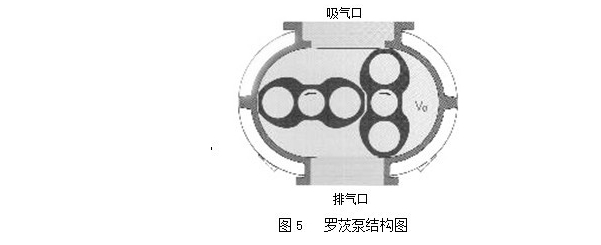 羅茨泵的結(jié)構(gòu)見圖5。在泵腔內(nèi),有一對8字形的轉(zhuǎn)子相互垂直地安裝在一對平行軸上,由傳動比為1的一對齒輪帶動作彼此反向的同步旋轉(zhuǎn)運(yùn)動。在轉(zhuǎn)子之間,轉(zhuǎn)子與泵殼內(nèi)壁之間,保持有一定的間隙,可以實(shí)現(xiàn)高轉(zhuǎn)速運(yùn)行。由于羅茨泵是一種無內(nèi)壓縮的真空泵,通常壓縮比很低,故需要前級泵。羅茨泵的極限真空除取決于泵本身結(jié)構(gòu)和制造精度外,還取決于前級泵的極限真空。為了提高泵的極限真空度,可將羅茨泵串聯(lián)使用羅茨泵的工作原理與羅茨鼓風(fēng)機(jī)相似。由于轉(zhuǎn)子的不斷旋轉(zhuǎn),被抽氣體從吸氣口吸入到轉(zhuǎn)子與泵殼之間的空間VO內(nèi),再經(jīng)排氣口排出。由于吸氣后VO空間是全封閉狀態(tài),所以,在泵腔內(nèi)氣體沒有壓縮和膨脹。