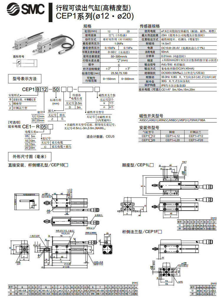 CE1PB12-50,CE1PB20-50,CE1PL12-50,CE1PL20-50,CE1PF12-50,CE1PF20-50,SMC行程可讀出氣缸