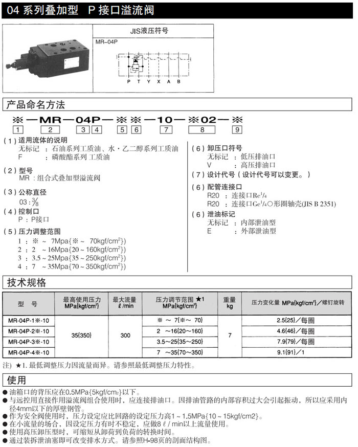 MR-04P-1-10,MR-04P-2-10,MR-04P-3-10,MR-04P-4-10,MR-04P-1V-10,MR-04P-2V-10,DAIKIN疊加型溢流閥