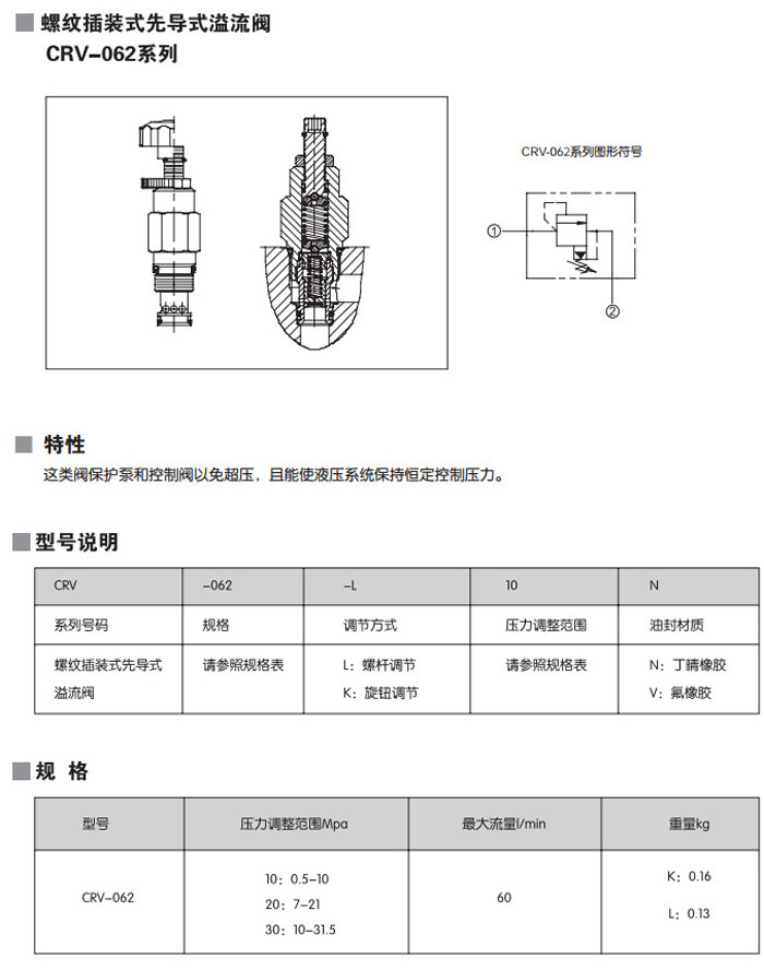 CRV-062-L10N,CRV-062-L20N,CRV-062-L30N,CRV-062-K10N,CRV-062-K20N,CRV-062-K30N,螺紋插裝式先導式溢流閥