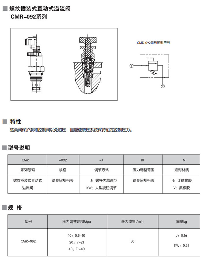 CMR-092-J10N,CMR-092-J20N,CMR-092-J40N,CMR-092-KW10N,CMR-092-KW20N,CMR-092-KW40N,螺紋插裝式直動(dòng)式溢流閥