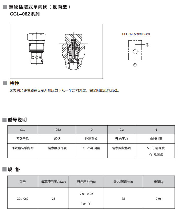CCL-062-X0.2N,CCL-062-X1.0N,CCL-062-X0.2V,CCL-062-X1.0V,螺紋插裝式單向閥