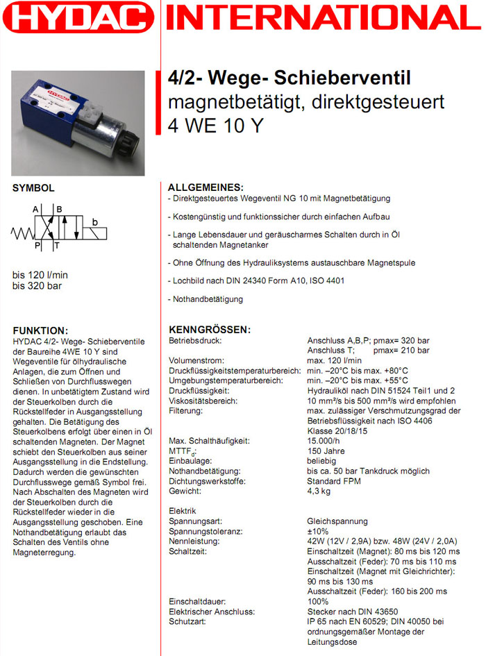 4WE10YS01-12DG/V,4WE10YS01-24DG/V,HYDAC電磁4/2方向滑閥